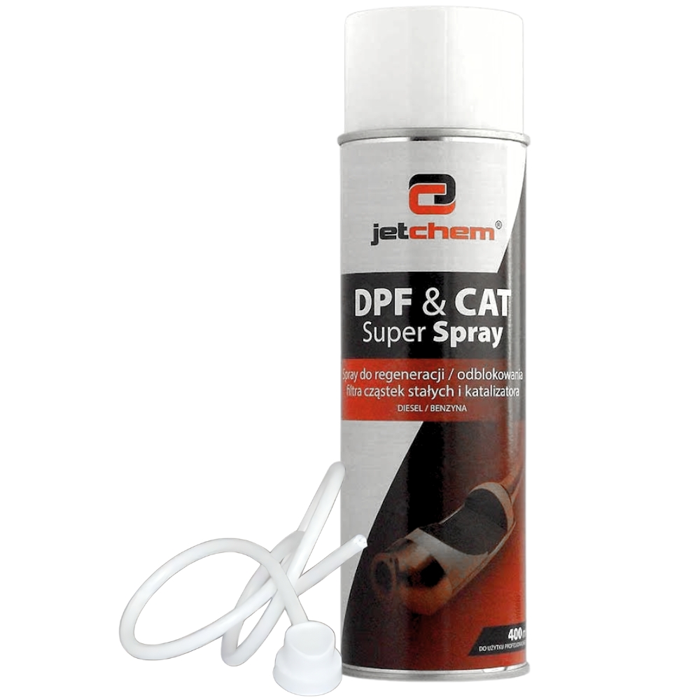 Jetchem DPF & CAT Super Spray to środek serwisowy, służący do oczyszczenia, z sadzy i popiołu, filtrów suchych i mokrych typu DPF oraz katalizatorów. Aplikacja preparatu jest prosta i możliwa do przeprowadzenia w warunkach warsztatowych i garażowych. DPF & CAT Super Spray został opracowany ze szczególnym uwzględnieniem doświadczeń serwisowych i zaawansowanych formuł chemicznych. Zawiera pianę o dużej aktywności składników, którą podajemy bezpośrednio poprzez otwór na czujnik ciśnienia czy temperatury, do wnętrza elementu. Sama metoda pozwala na bezpieczne usunięcie zanieczyszczeń, bez naruszania czy rozcinania filtra, katalizatora. Preparat osiąga bardzo wysoką skuteczność pod warunkiem zachowania serwisowej procedury aplikacji i o ile oczyszczany element nie jest całkowicie zapełniony, zablokowany. Czyszczenie przy pomocy DPF & CAT Super Spray jest bardzo pożądane ponieważ filtr typu DPF jest głównie zapychany przez dwie rzeczy : sadzę i popiół. O ile zapchanie I-go stopnia przez sadzę, możemy eliminować stosując dedykowane dodatki do paliwa czy wymuszenie "procedury dopalania sadzy" w trasie, to niestety popiołu w ten sposób z filtra DPF się nie pozbędziemy. Wypalanie filtra komputerem nigdy nie usunie popiołu. Z czasem popiół całkowicie zablokuje filtr i w najlepszym wypadku ( a nie jest to zawsze możliwe) pozostanie regeneracja, a w najgorszym wymiana go w ASO na nowy, kosztujący kilka tysięcy zł. Zatkany filtr DPF może doprowadzić do uszkodzenia lub przedwczesnego zużycia turbosprężarki.