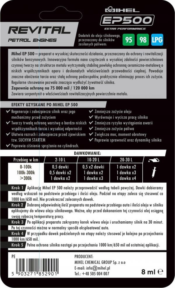 MIHEL EP500 Petrol Engines – niezwykle skuteczny preparat, który został stworzony w celu ochrony i odnowy silników benzynowych. Jego innowacyjna formuła, oparta na nano cząsteczkach o wysokiej zdolności powierzchniowo czynnej, tworzy trwałą powłokę ceramiczno-metalową na strukturze metalu. Dzięki temu preparatowi, silniki są chronione przed zużyciem, a tarcie zostaje znacznie obniżone. To sprawia, że podzespoły silnika są praktycznie niepodatne na proces zużycia, co znacząco wydłuża żywotność całego silnika.