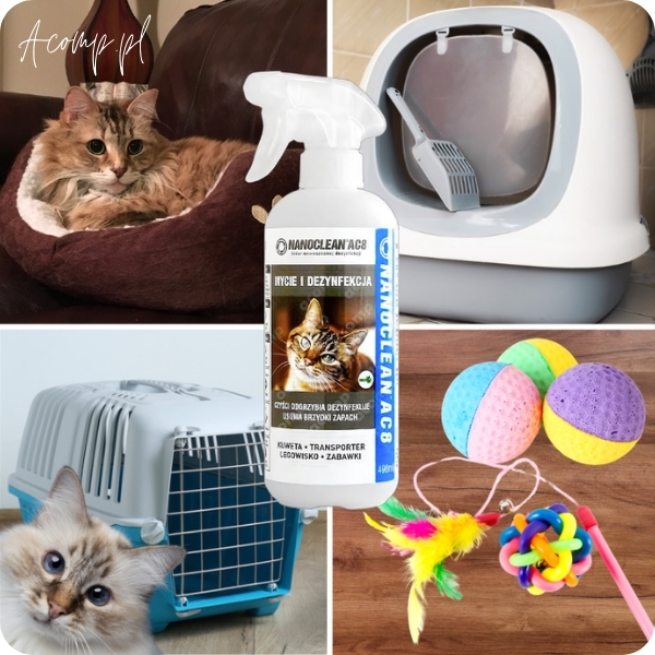 - Spryskaj AC8 KOT wszystkie powierzchnie, w tym czyszczoną kuwetę, legowisko, zabawki, miski i inne miejsca, w których przebywa kot.
