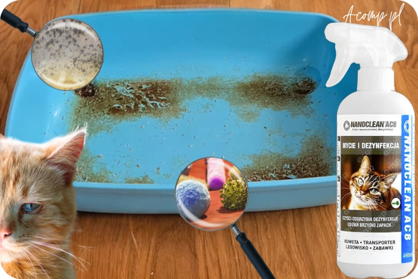 NANOCLEAN®AC8 Home KOT odświeża powierzchnie, neutralizując intensywne kocie zapachy wymiocin, moczu, zapach odchodów wsiąkniętych w ścianki kuwety. Skutecznie usuwa brud z misek na jedzenie i wodę oraz odgrzybia legowiska, zapewniając zdrowe środowisko. Dezynfekuje akcesoria i zabawki, eliminując bakterie i drobnoustroje oraz zabezpiecza powierzchnie, sprawiając, że są one odporne na przyszłe zabrudzenia. Preparat o całkowitym spektrum 5w1 - CZYŚCI, ODŚWIEŻA, ODGRZYBIA, DEZYNFEKUJE i ZABEZPIECZA w jednym procesie, co skraca pracę, koszty i gwarantuje skuteczność dezynfekcji na najwyższym poziomie. Działanie biobójcze zapewnia długotrwałe odkażenie co jest niebywale istotne w wypadku Kaliciwirozy czy wirusa Panleukopenii u kota. W tak trudnych przypadkach należy wszystko zdezynfekować z czym kot ma styczność aby nie zarazić innego czy nowego następcy, poprzedniego pupila.