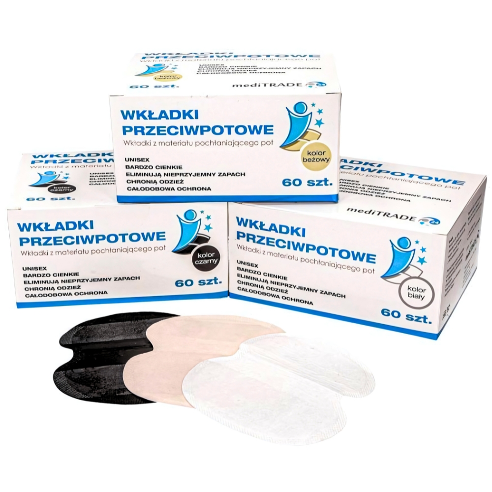 mediTRADE wkładki przeciwpotowe 60 szt. - rozmiar dla kobiet i mężczyzn (UNISEX). Z dostępnych wkładek są jednymi z najlepszych jakościowo. Mają dobry klej, nie przesuwają się i wzorowo pochłaniają pot. Nie brudzą i nie rozwarstwiają się oraz nie skręcają się jak inne odpadające po godzinie.