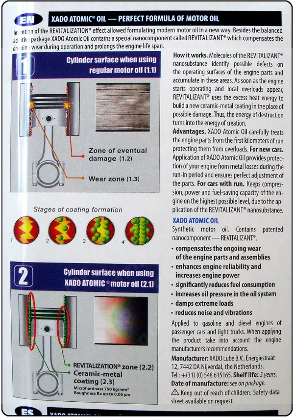 Olej XADO zawiera opatentowany nano-komponent budulcowy, Revitalizant®. Jego ilość w oleju jest tak wyliczona, że zużycie par trących np. tłok-pierścień-cylinder praktycznie zatrzymuje się w czasie. Wykorzystane jest tu zjawisko selektywnego przenoszenia (ang. selective transfer). Czyli zjawisko samorzutnego regenerowania zużytych powierzchni metalu w wyniku wbudowania cząsteczek pochodzących z innych miejsc układu.